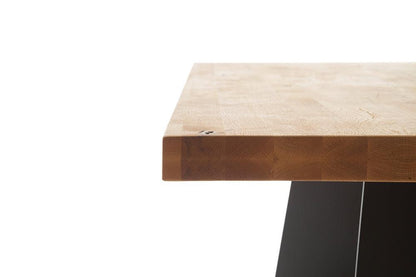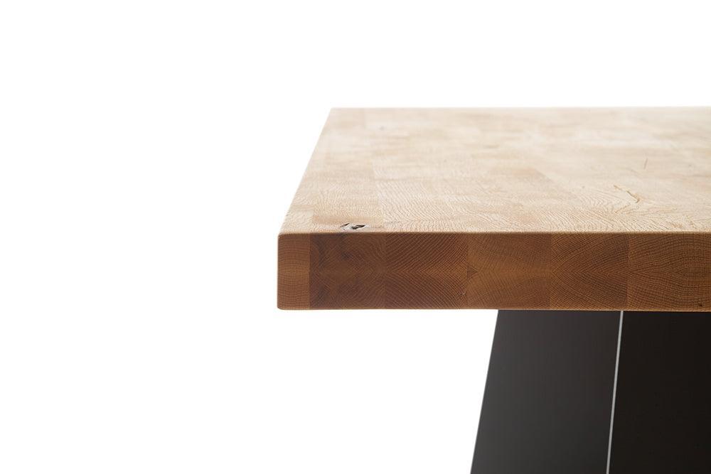 Massivholzbalken in Balkeneiche. Tischplatte aufgedoppelt.