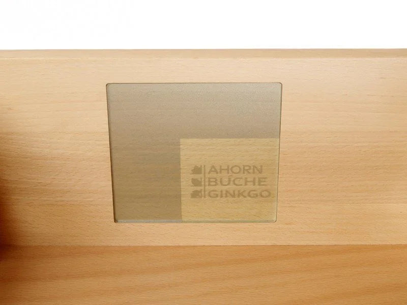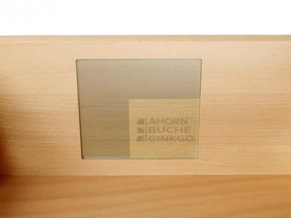 Buchenholz massiv, Acrylplatte 12 x 12 cm mit Herstellerlogo, Edelstahlringe an den Griffen