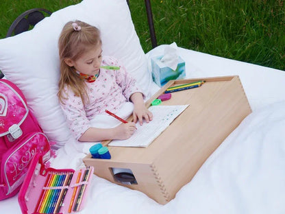 Der Clou! "Uschi" ist eine Verwandlungskünstlerin. Im Handumdrehen vom Tablett zum Beistelltisch, Spieltisch, Bord, Lesestütze oder Schreibtisch. Funktionen ohne Grenzen - mehr als nur ein Tablett, das ist das Besondere an "Uschi". Durch die inkludierte Massivbuche-Aufhängerleiste ist das Tablett aufgeräumt und schafft Ordnung.