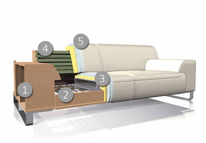 5. Polsteraufbau Rücken aus ergo-PUR-Schaum und hochwertigem Gemisch aus Polyesterfasern und Schaumstoffstäbchen, in Kammern gefüllt, Diolenabdeckung
