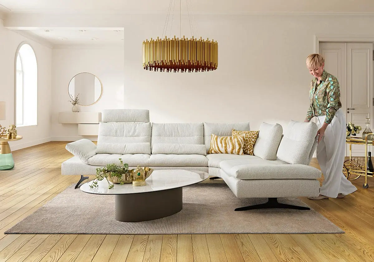 Mehr als nur ein Möbelstück. Dieses Ecksofa ist ein Ort, an dem Geschichten entstehen, Erinnerungen geformt werden und das Zuhause seine Seele findet. Die integrierte Sitztiefenverstellung passt sich mühelos an die Besitzer an. Die optionale Seitenteilverstellung setzt bei den Themen des gemütlichen Kuschelns oder geselligen Beisammenseins noch eins obendrauf. Getragen von eleganten Metallkufen, die dem Ecksofa eine schwebende Leichtigkeit verleihen, strahlt seventy5 eine kraftvolle Präsenz aus, gepaart mit Persönlichkeit, Stil und einem Ort voll wohnlicher Behaglichkeit.