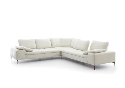 Unser hochwertiges Ecksofa valentinoo in Leder Cream White mit Seitenteilkissen und Metallfüßen in Bronze ist eine perfekte Wahl für jeden, der nach einem stilvollen und bequemen Möbelstück sucht. Das Sofa ist aus qualitativ hochwertigem Leder gefertigt, das nicht nur langlebig ist, sondern auch ein elegantes und zeitloses Aussehen hat.